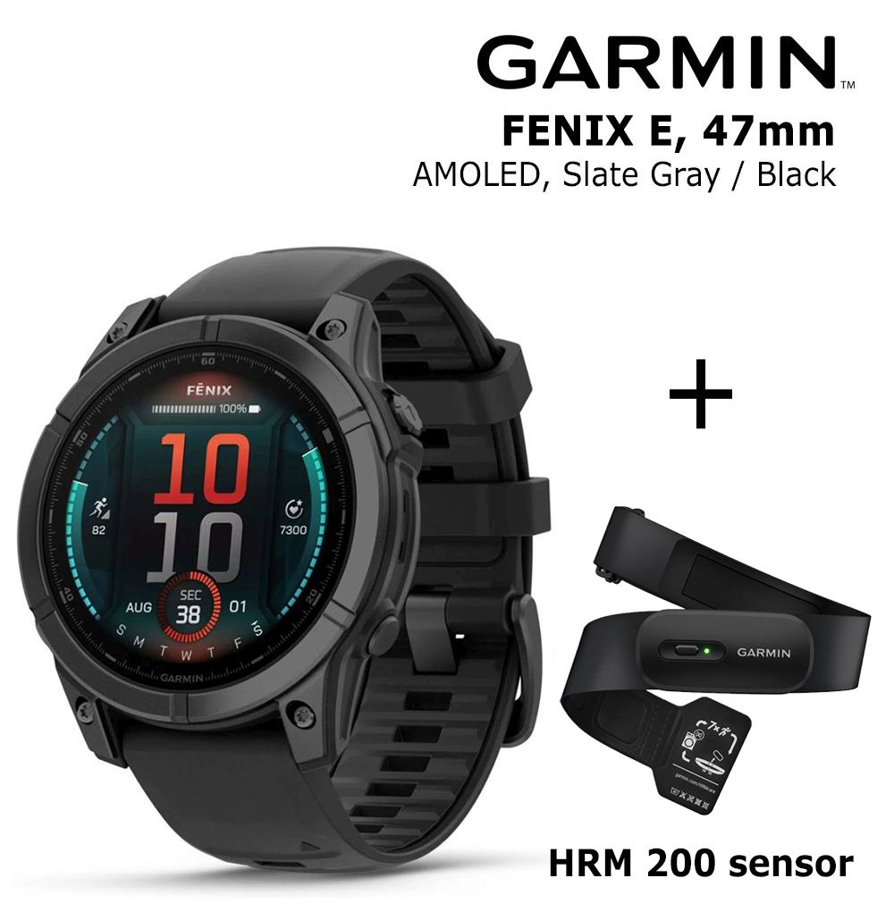 GARMIN Fenix E 47 mm, AMOLED, Slate Gray Steel + Garmin HRM 200 Sensor sports watch