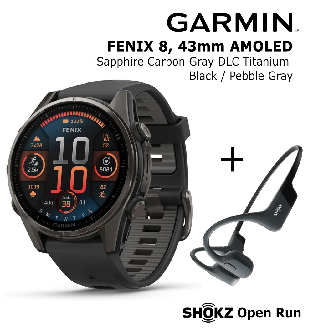 GARMIN Fenix 8 43 mm, AMOLED, Sapphire Carbon + SHOKZ Open Run Black sports watch