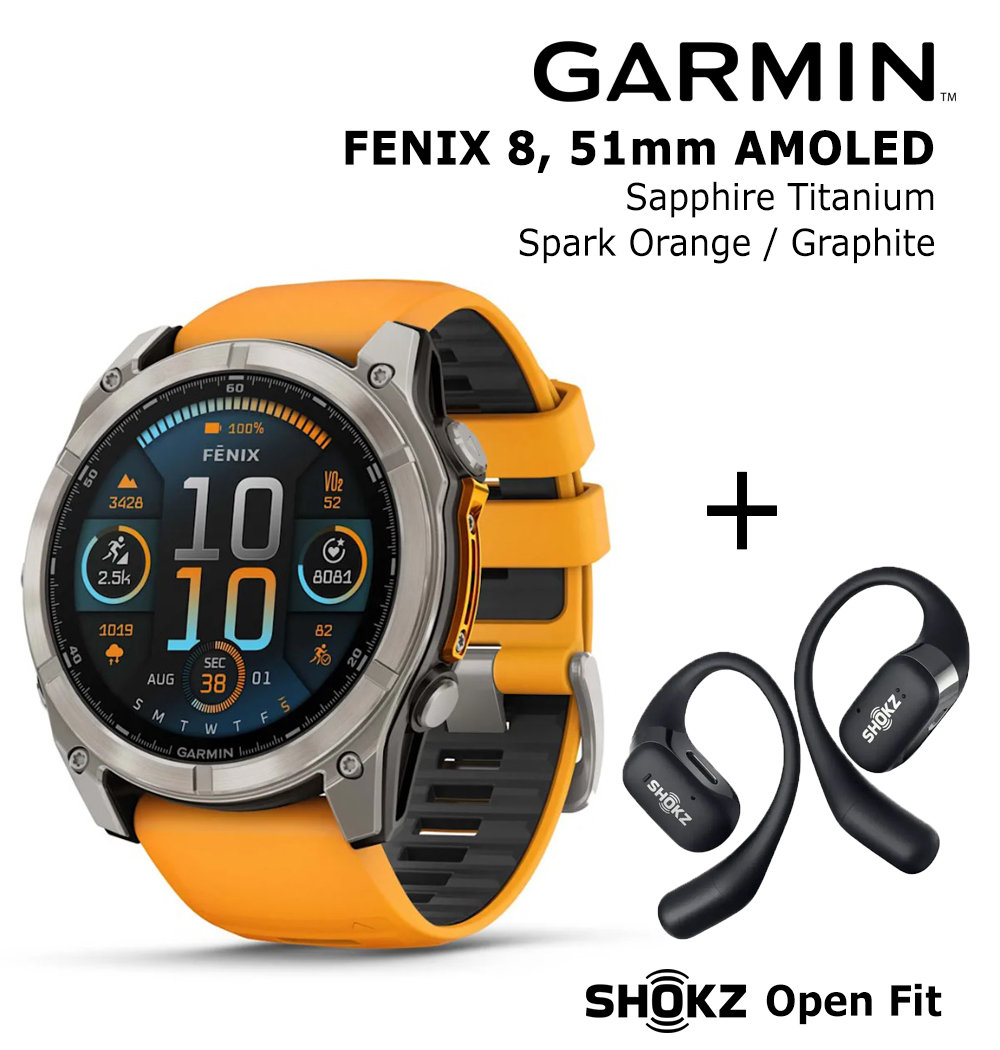 GARMIN Fenix 8 51 mm, AMOLED, Sapphire Titanium + SHOKZ Open Fit Black sports watch