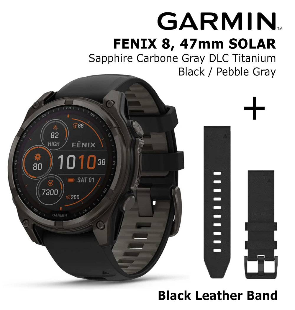 GARMIN Fenix 8 47 mm, Solar, Sapphire Carbon + Black Leather Watch Band, QuickFit 22mm sports watch