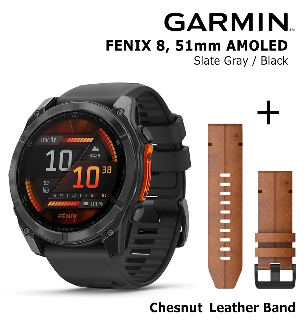 GARMIN Fenix 8 51 mm, AMOLED, Slate Gray + Chestnut Leather Band sports watch
