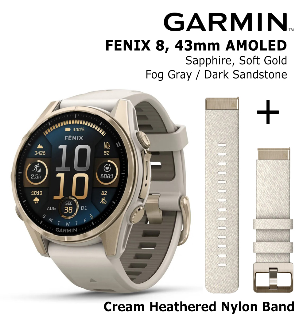 GARMIN Fenix 8 43 mm, AMOLED, Sapphire Soft Gold + Cream Heathered Nylon Band sports watch