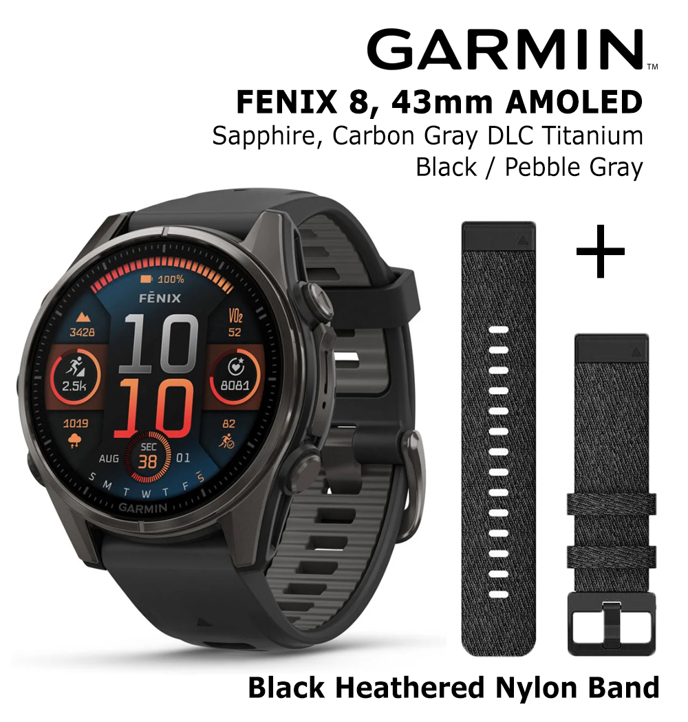 ✅ Sports watch Garmin Garmin Fenix 8 43 mm, AMOLED, Sapphire Carbon Gray DLC Titanium with Black/ Pebble Gray Silicone (code: 010-02903-21)