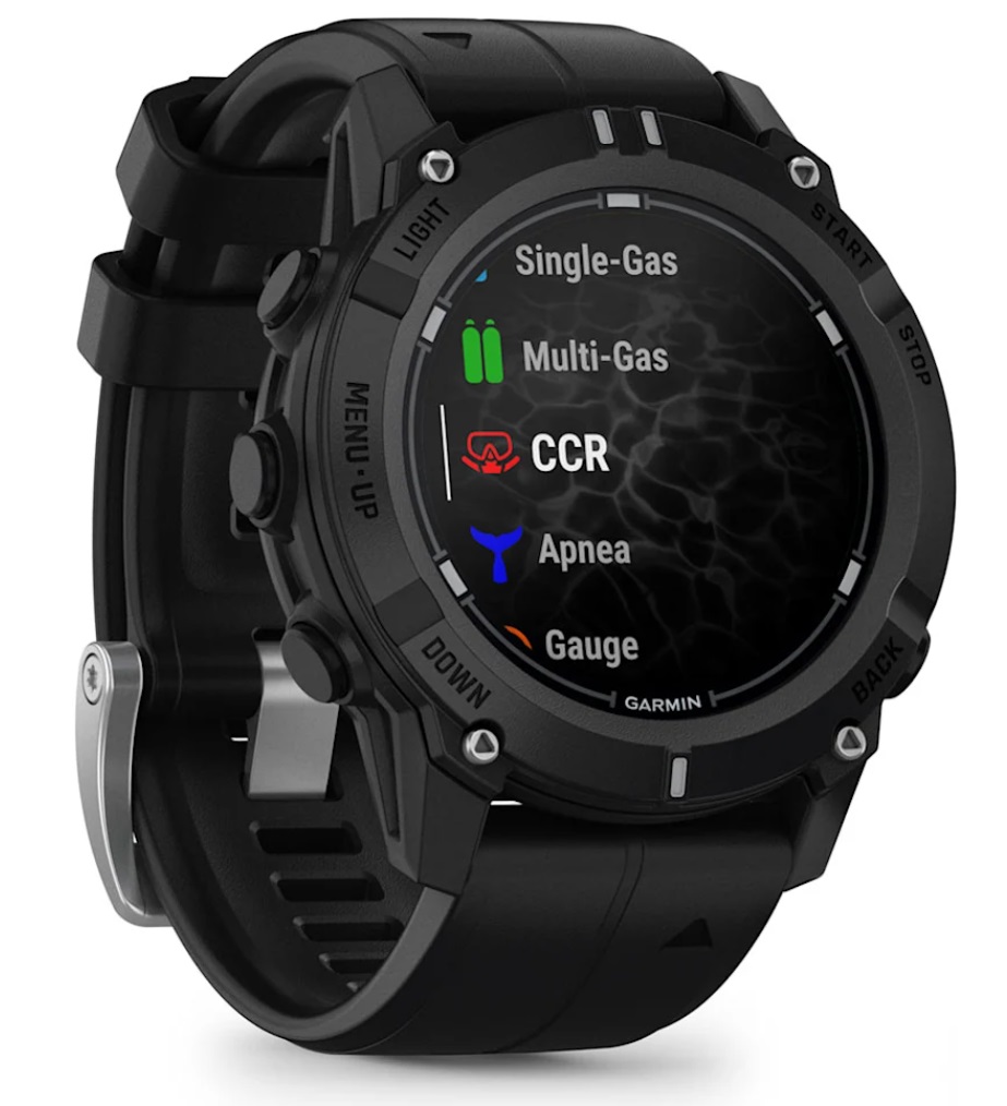 The 1.2″ AMOLED display makes it easy to read at any depth, and it features a sapphire lens and sealed buttons, as well as 10 ATM water resistance.