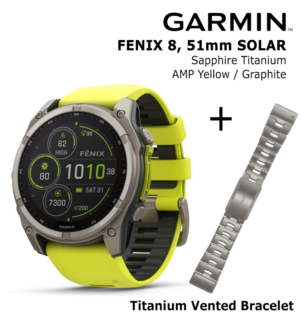 ✅ Sports watch Garmin Fenix 8 51 mm, Solar, Sapphire Titanium with Amp Yellow/ Graphite Silicone Band (code: 010-02907-21)